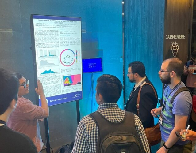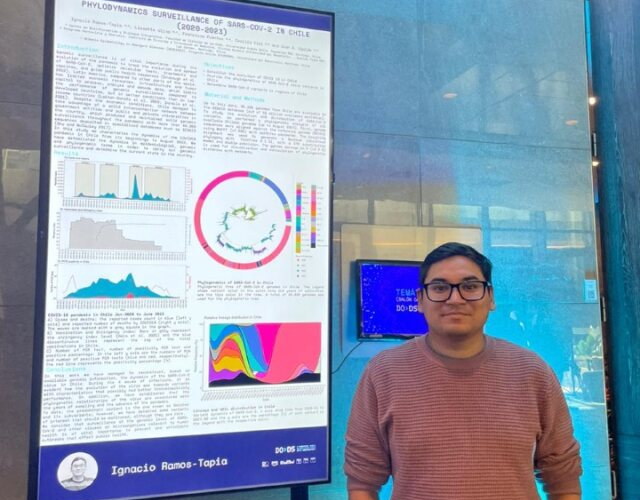 Por su parte, Ignacio Ramos-Tapia presentó en el poster titulado Phylodinamics Surveillance of SARS-CoV-2 in Chile (2020-2023), la importancia de la vigilancia genómica y el proceso de describir y caracterizar, desde el punto de vista genómico, la realidad de la pandemia de Covid-19 en nuestro país a partir de la utilización y análisis de datos públicos disponibles.